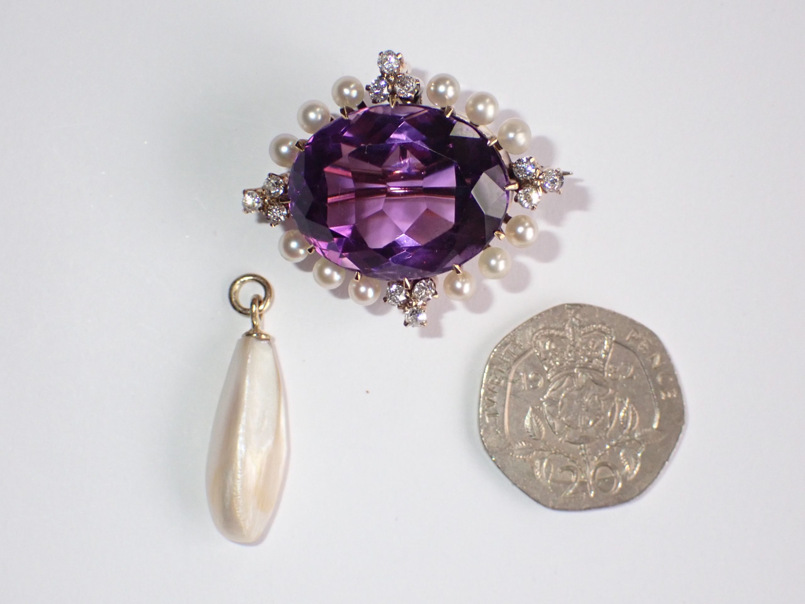 A fine quality & condition 18ct gold Siberian amethyst, natural pearl & diamond pendant/brooch with detachable pearl drop